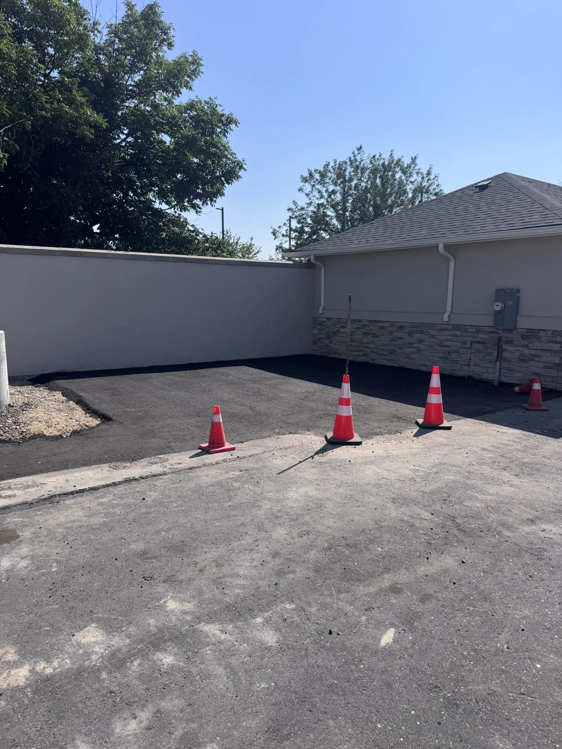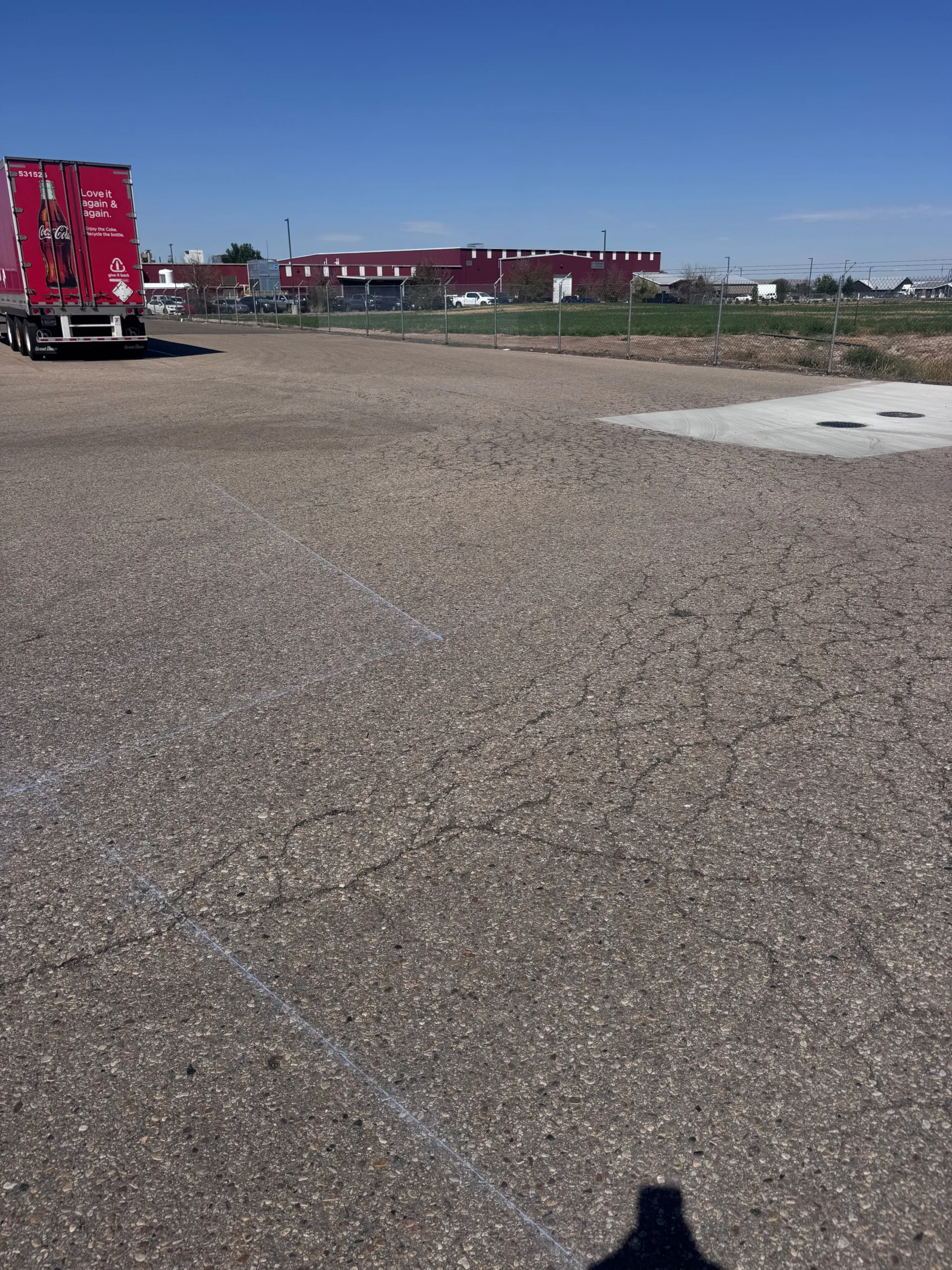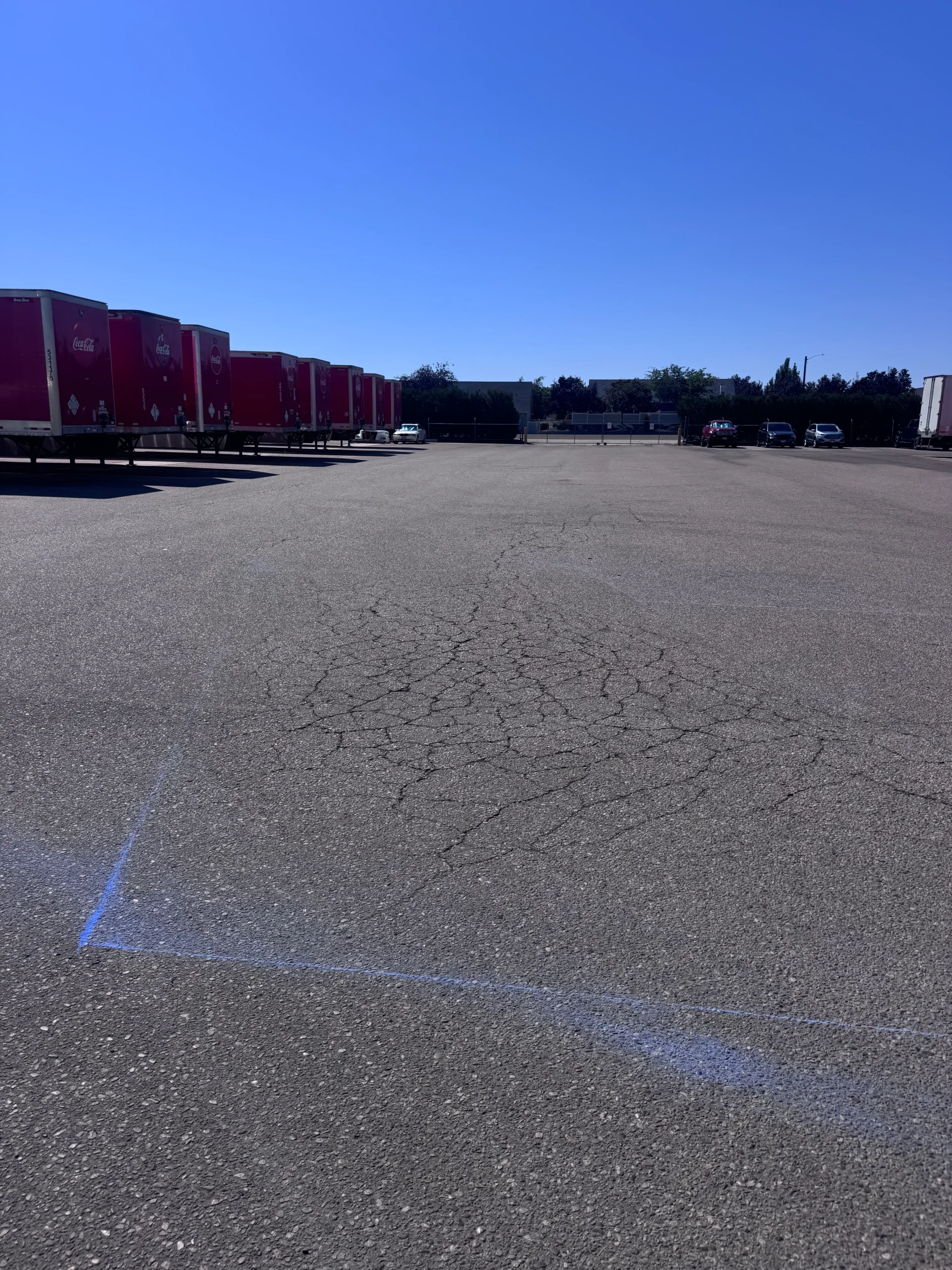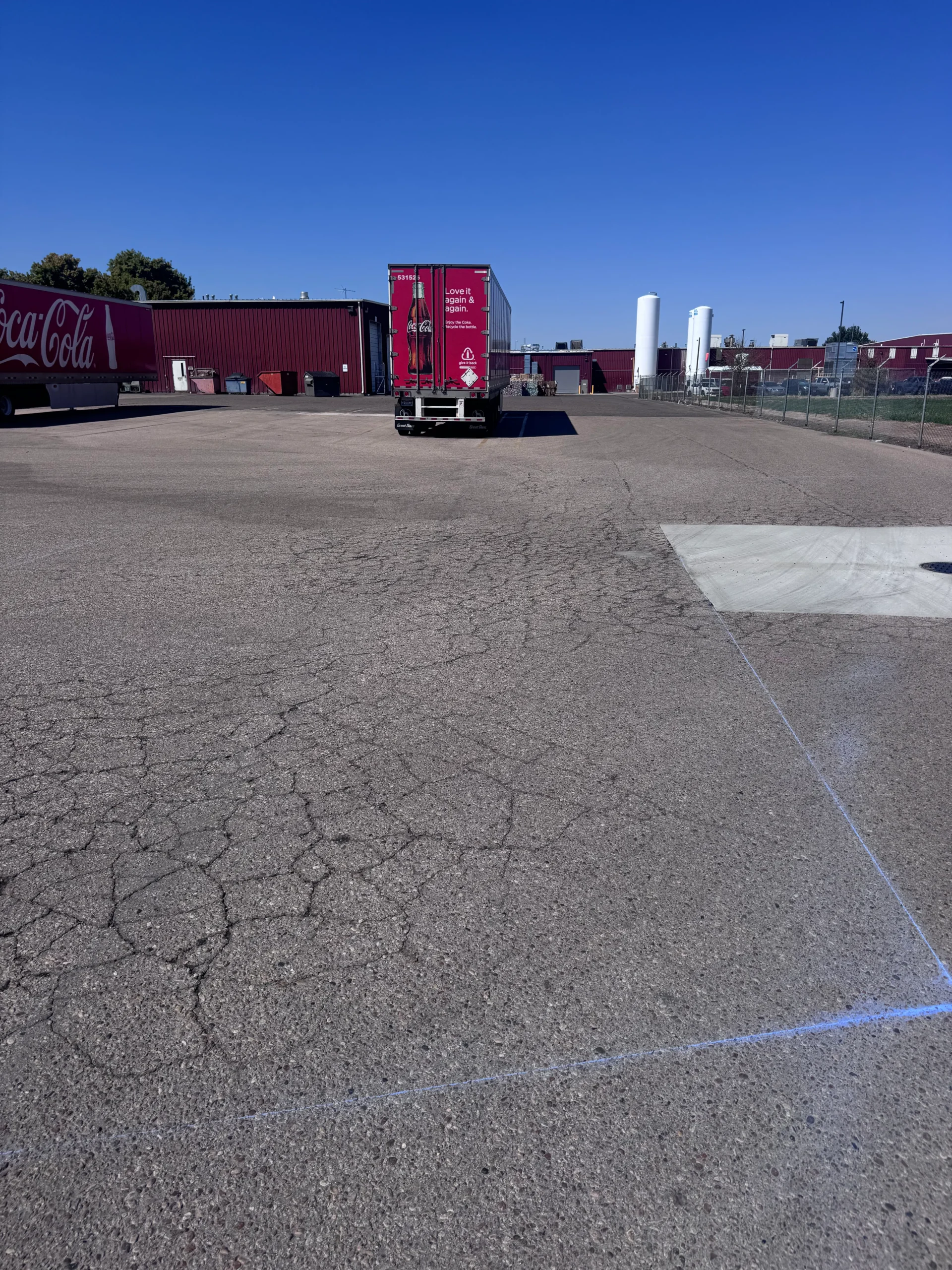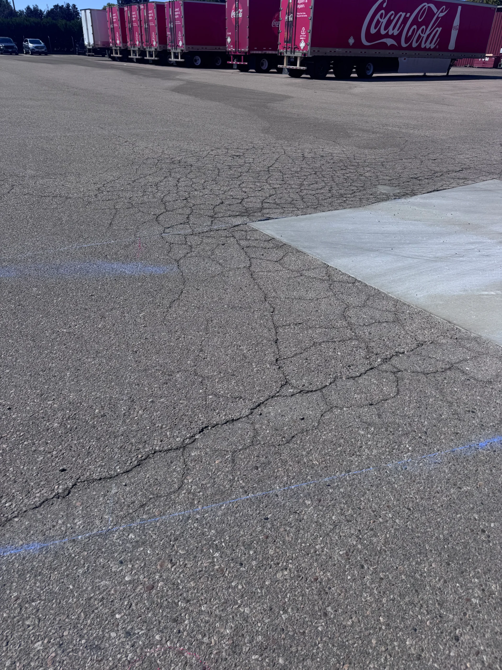 At the Coca-Cola distribution facility, our crew carried out asphalt patching to restore the integrity of the pavement. The work involved cutting out deteriorated areas, removing cracked asphalt, and replacing them with new hot mix asphalt. Each section was carefully leveled and compacted with professional equipment to ensure durability and a smooth driving surface. This repair helps extend the lifespan of the pavement and supports the heavy daily traffic of delivery trucks and warehouse operations.